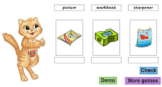 Nomeie os objetos. Após iniciar o jogo, aparecem três objetos nos retângulos. Arraste para baixo das figuras os nomes corretos dos objetos.